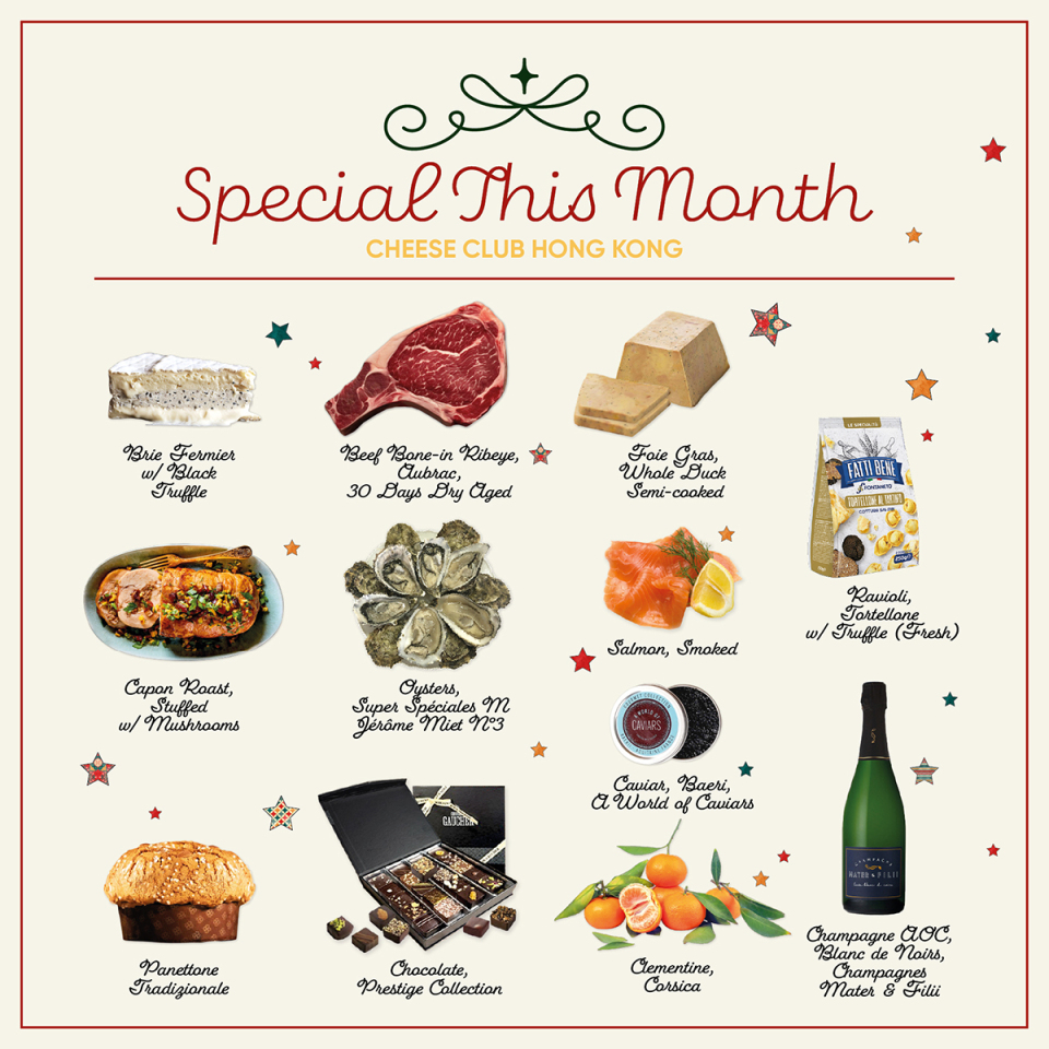 MONTHLY OFFER – 預售多款芝士、冷切盤、海鮮、紅酒和甜品,11月28日-12月7日下單,慶祝聖誕節的,可選擇於12月20至12月23日送貨。慶祝元旦的,則可以下一張新單,並選擇於12月29或30日送貨。