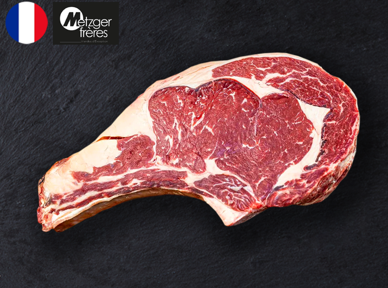 Selected and expertly prepared by Metzger Frères, this bone-in ribeye is a prime example of their butchery skill. Sourced from grass-fed, ethically raised cattle, it undergoes a careful 15-day dry aging process to concentrate its flavour and enhance tenderness.