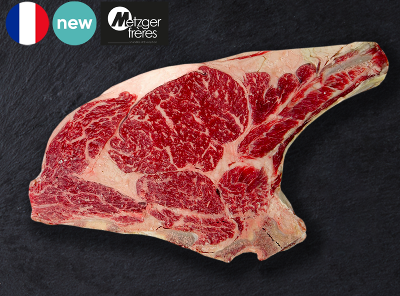 Savor our Beef Bone-in Ribeye from the world-famous Simmental breed, one of the most widespread cattle breeds globally. Originating from the Swiss and Austrian Alps, prized by farmers for its hardiness, adaptation to harsh climates, and dual milk/meat aptitude, this premium cut is dry-aged 30 days by Metzger Frères.