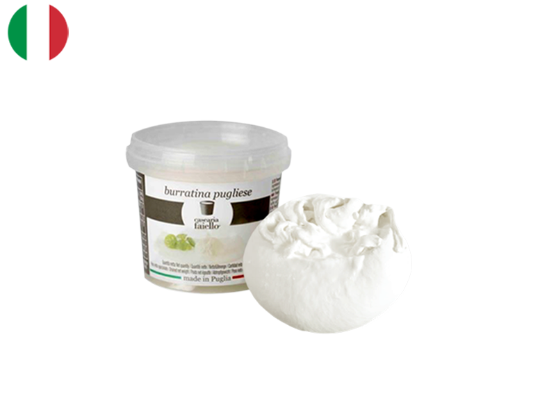 First produced by the Bianchini Family in the Apulia region in the 1920s, Burratina is prepared like Mozzarella. The key difference is that its white, creamy filling contains pieces of cream called stracciatella.