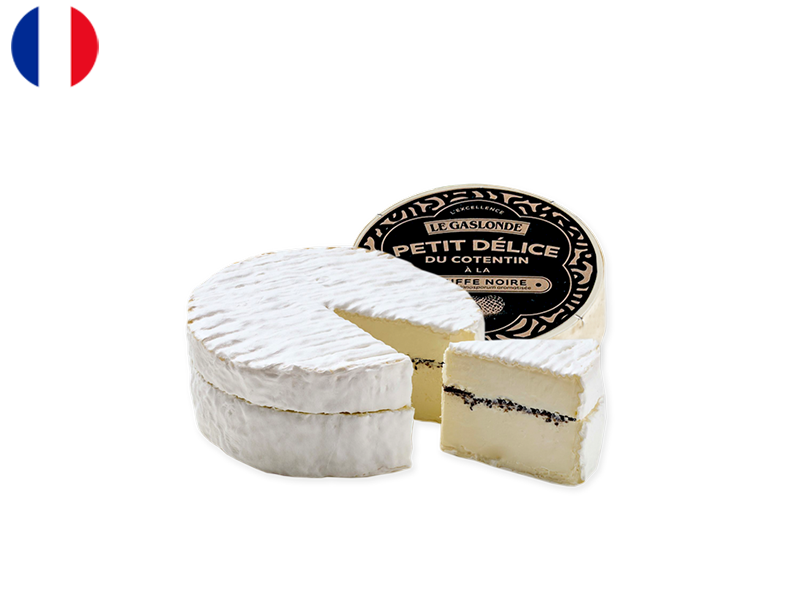 This Camembert from Normandy is delicately infused with Melanosporum truffle, offering a harmonious blend of creamy cheese and the subtle, earthy notes of black truffle. The combination highlights the natural richness of the milk and the refined character of the truffle.