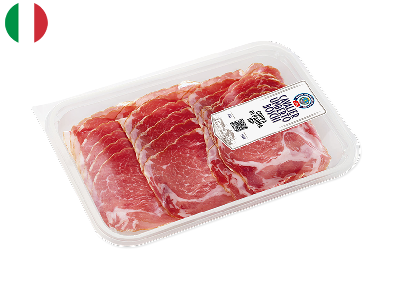Coppa is a classic product from Parma’s rich tradition of cured pork. Made from the muscular cut near the pig’s neck and traditionally wrapped in natural beef casing, it is aged for at least six months.