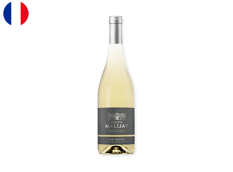 The Côtes-du-Rhône Blanc, M de Malijay, is a sun-kissed blend of Clairette, Grenache Blanc, and Viognier, cultivated on the stony hillsides of the Southern Rhône Valley. This terroir imparts a characteristic roundness and a distinctive minerality to the wine.