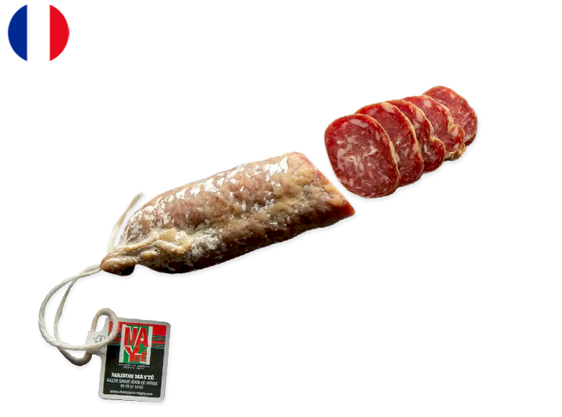 The Dry Sausage of Maison Mayté is an exceptional charcuterie product from the heart of the Basque Country, an area famed for its rich culinary traditions. Made from the finest cuts of pure pork, this dry sausage showcases the dedication and expertise of Maison Mayté’s artisans. The traditional curing process imparts a robust, savoury flavour that is truly unforgettable.