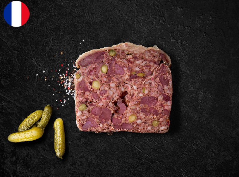 This hearty terrine is crafted from coarsely minced duck meat and liver, enriched with Armagnac, fragrant herbs, and black pepper. Slow-cooked in a traditional terrine dish, it achieves a luxuriously rich, firm-yet-spreadable texture and a deep, robust flavour with a perfect balance of savoury and spiced notes.