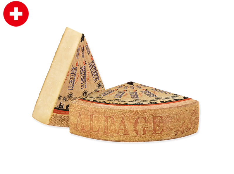 The Gruyère Alpage aged 12 months is an alpine cheese known for its nutty, savoury flavour and dense, firm texture. Made from the milk of cows grazing in high-altitude pastures, this cheese develops rich, earthy notes as it matures.