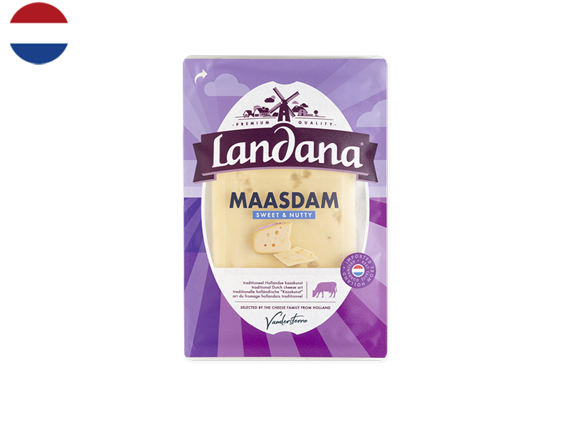 Discover the buttery goodness of Maasdam cheese, a Netherlands-style cheese renowned for its sweet and nutty flavour profile. With its characteristic holes and smooth texture, Maasdam is great for melting in sandwiches or enjoying on its own as a snack. And for even more conveniency, it comes already sliced! Dive into its creamy richness and savour the taste of this timeless cheese classic.