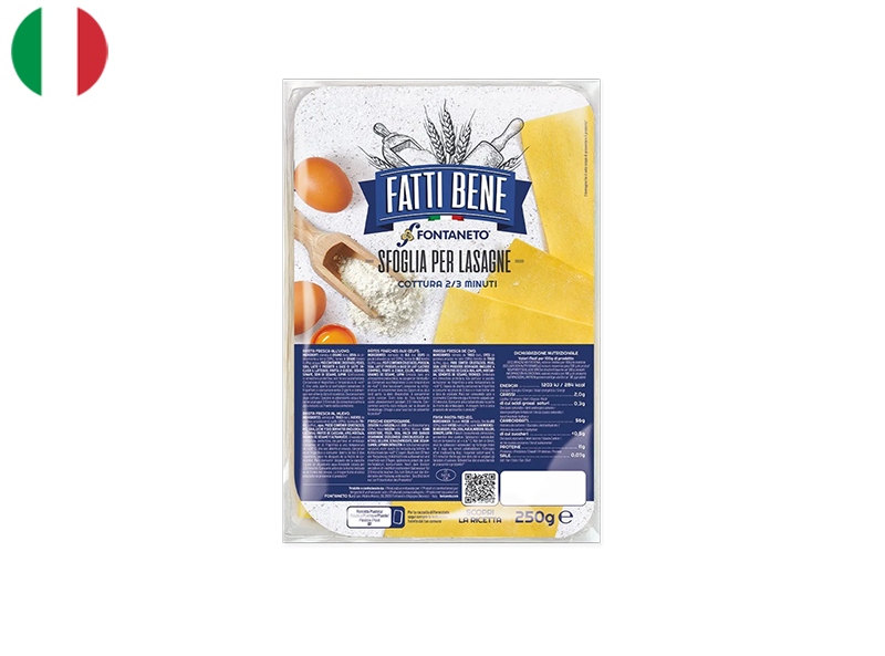 These fresh lasagna sheets are made using simple yet traditional ingredients like grana flour and selected eggs, which give the pasta its delicate aroma and intense golden color.