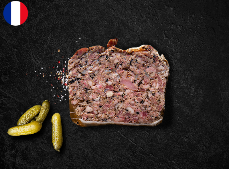 This rustic terrine is made from finely minced, tender rabbit meat, seasoned with a balanced blend of aromatic herbs, garlic, and brandy. It is slowly cooked to achieve a dense, moist texture and a deep, savoury flavour with subtle gamey notes.