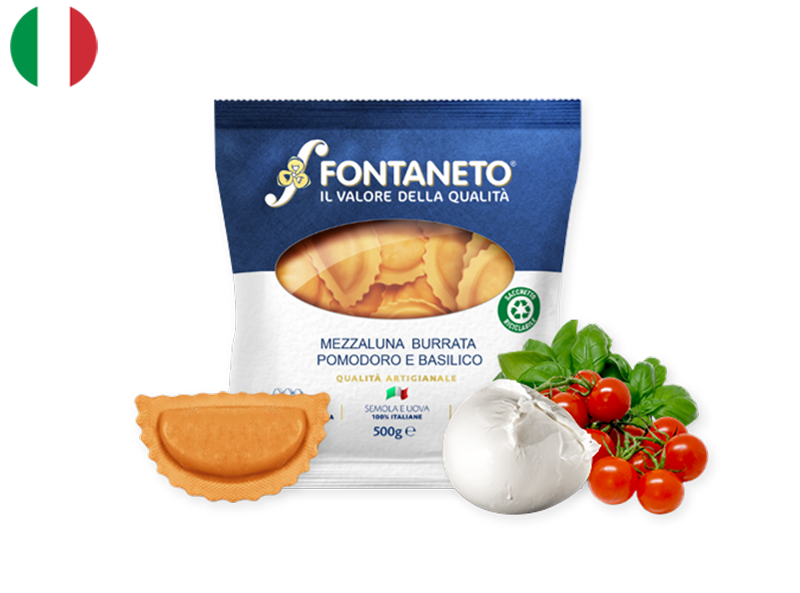 Well-known as a cherished traditional specialty, Ravioli are delicate Italian dumplings made from fresh egg pasta. Shaped as elegant half-moons, these ravioli are generously filled with creamy burrata cheese, complemented by the vibrant flavours of ripe tomato and fragrant fresh basil.