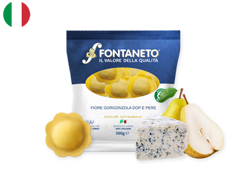 Fontaneto, a distinguished Italian pasta producer, offers a delectable Ravioli with Gorgonzola and Pear. This fresh pasta dish harmoniously combines the robust, creamy notes of Gorgonzola cheese with the subtle sweetness of ripe pears, encapsulated within tender ravioli.