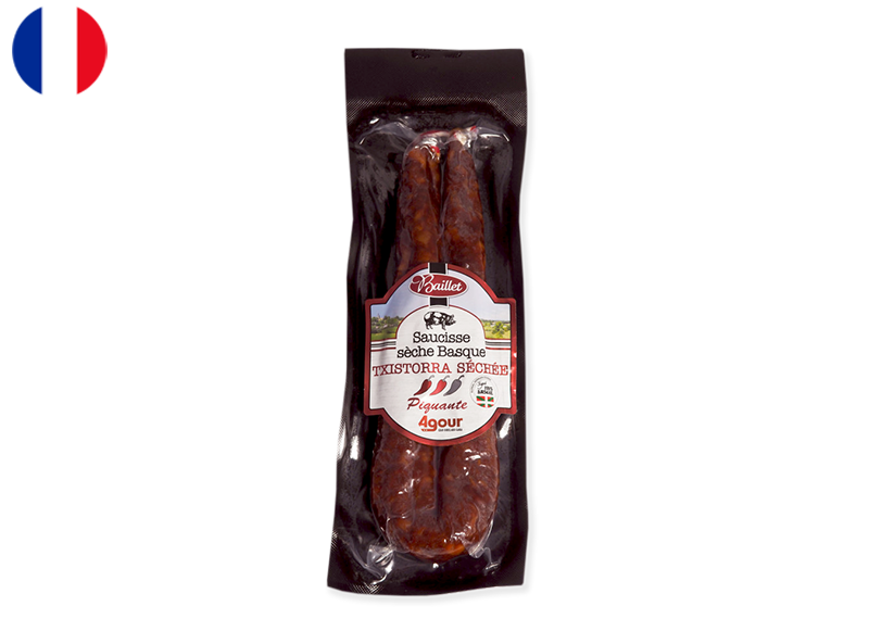 A speciality of the Basque Country, this fine pork sausage is delicately spiced with paprika. An alternative to chorizo, which can be cut into small pieces to be fried, or served as tapas.