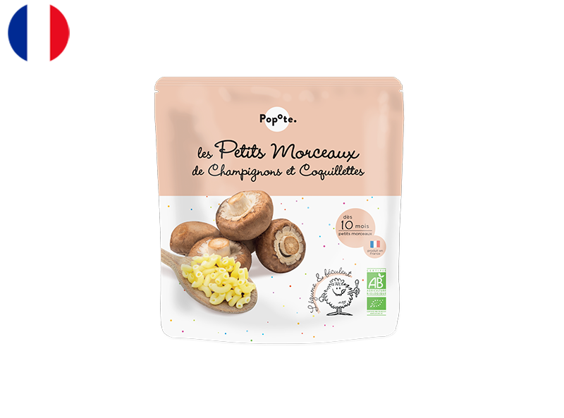 The Champignons and Coquillettes Popote is a tasty puree made from organic mushrooms and small pasta, perfect for babies aged 8+ months. This meal offers a rich, earthy flavour and a smooth, comforting texture that’s easy for young palates to enjoy.