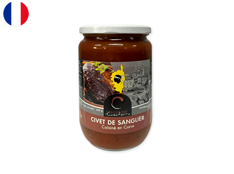 Wild Boar Stew or Civet de Sanglier in French is a traditional Corsican dish rooted in the island’s rural hunting culture. Prepared by Casatorra, a respected Corsican producer known for preserving authentic local recipes, this stew brings together wild boar meat slowly braised in a rich sauce of red wine, onions, carrots, garlic, and aromatic herbs.